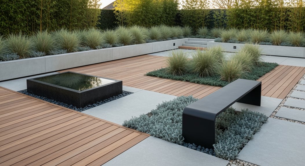 Nachdem klare Achsen und funktionale Knotenpunkte festgelegt wurden, verstärken Materialwahlentscheidungen die geometrische Ordnung und erfüllen zugleich praktische Anforderungen an Kosten, Haltbarkeit und Oberfläche. Holz bietet Wärme und Maserungskontrast; langlebige Arten (Eiche, Lärche, Ipe) gleichen Anschaffungskosten durch Langlebigkeit und Wartungsaufwand aus. Stein verleiht strukturelle Beständigkeit – lokaler Sandstein oder Granit variieren im Preis, erfordern aber minimalen Pflegeaufwand und sind frostbeständig. Metall, typischerweise Cortenstahl oder verzinkter Stahl, sorgt für klare Kanten und schlanke Profile; berücksichtigen Sie Korrosionsraten und Austauschkosten.